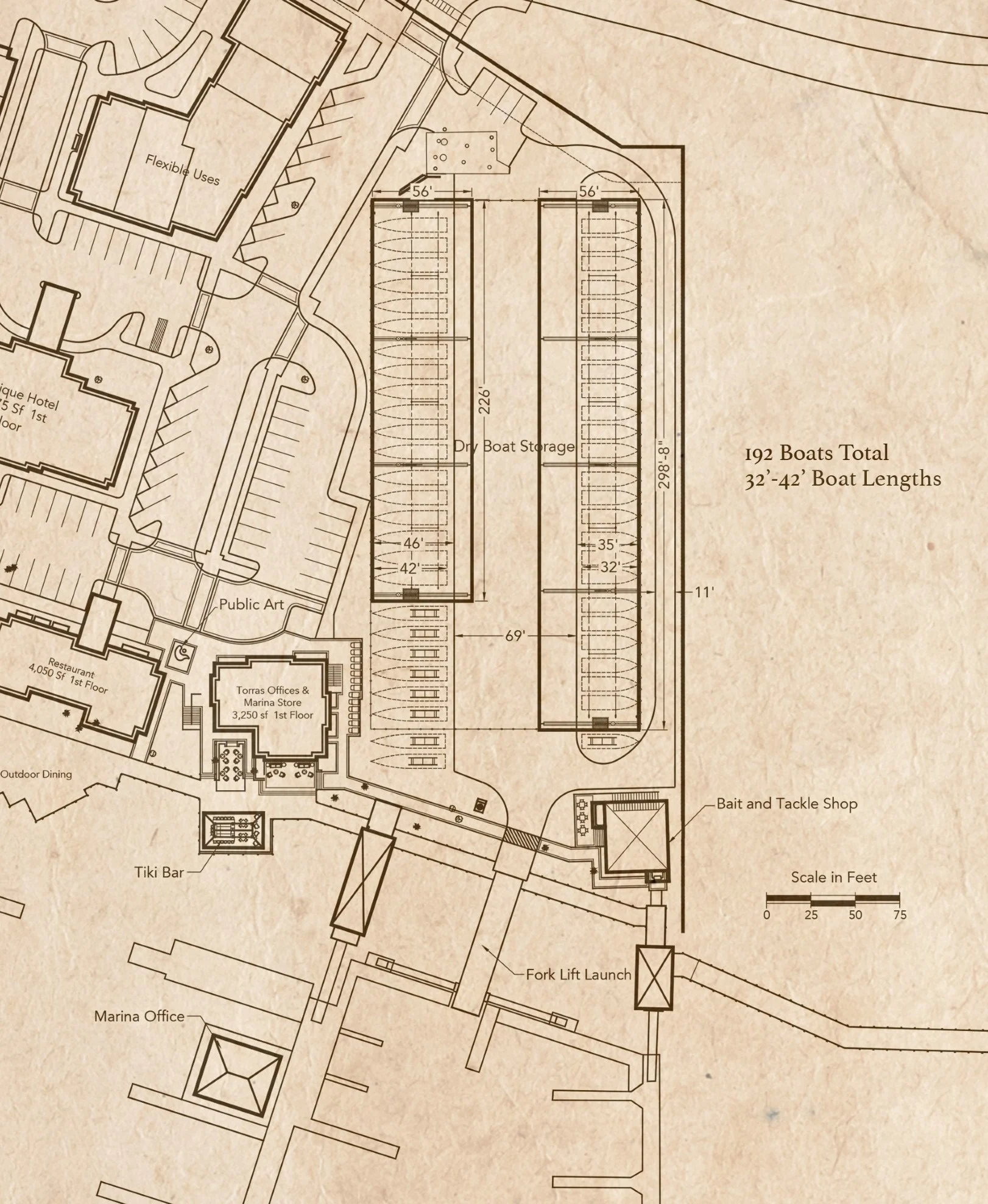 We will be able to store vessels in our dry racks up to 43′ 3″ LOA (including outboards in down position).